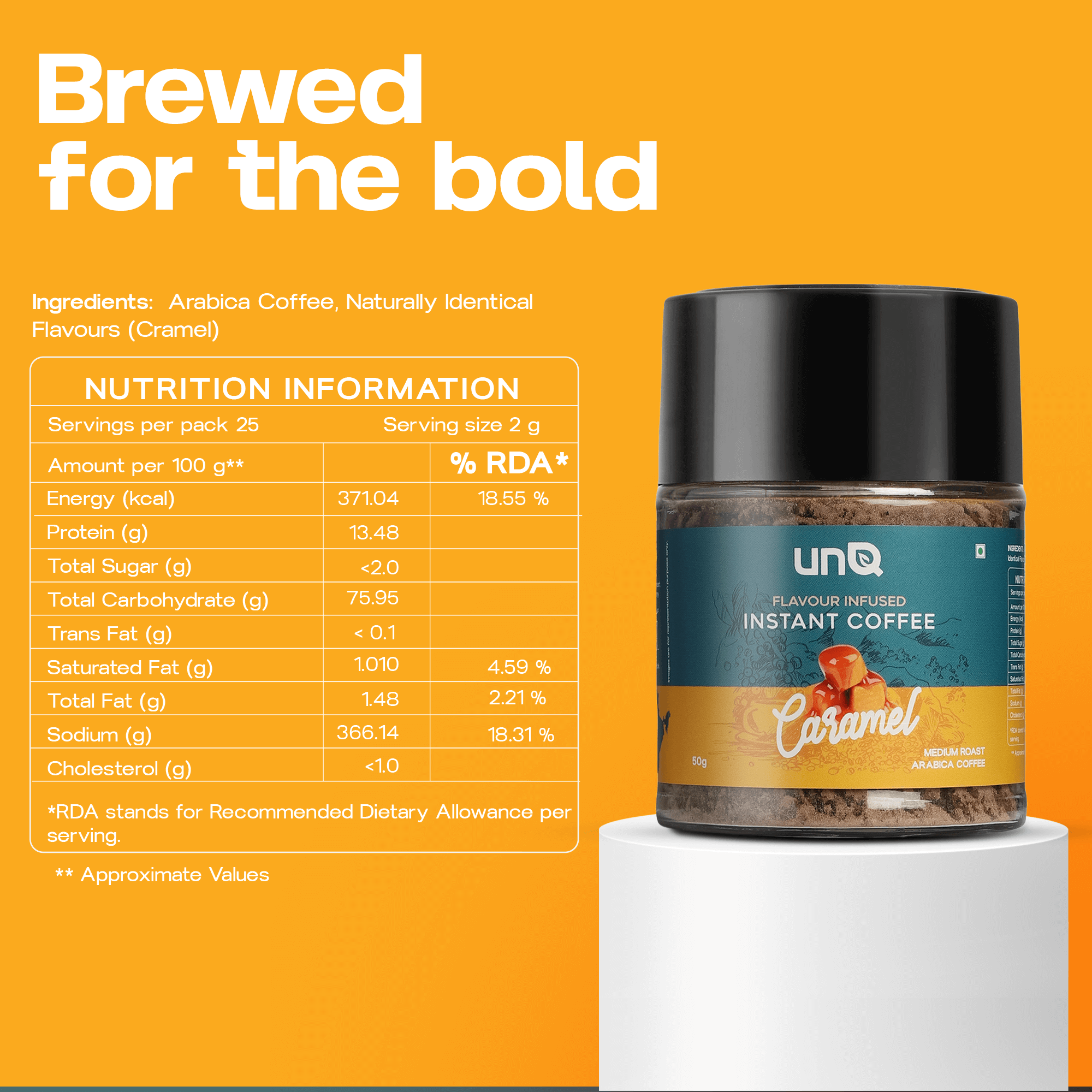 unQ Caramel Instant Coffee brings together smooth coffee and creamy caramel for a sweet, easygoing cup. It mixes instantly, giving you great flavor without any effort. Enjoy it hot for a cozy treat or cold for a refreshing caramel lift. With no preservatives and a handy 50g size, it’s perfect for everyday enjoyment at home or at work.