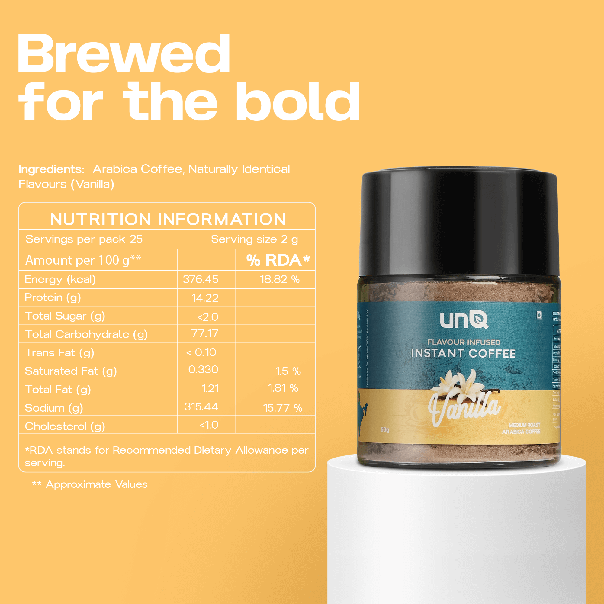 unQ Hazelnut Instant Coffee delivers a smooth coffee base enhanced with the warm, nutty aroma of roasted hazelnut. Formulated for quick and effortless preparation, it dissolves instantly to provide a balanced, aromatic cup every time. The larger 100g pack offers excellent value and convenience, making it ideal for daily enjoyment at home, at work, or anytime you want a comforting, hazelnut-infused coffee experience.